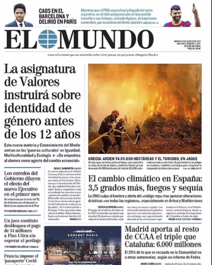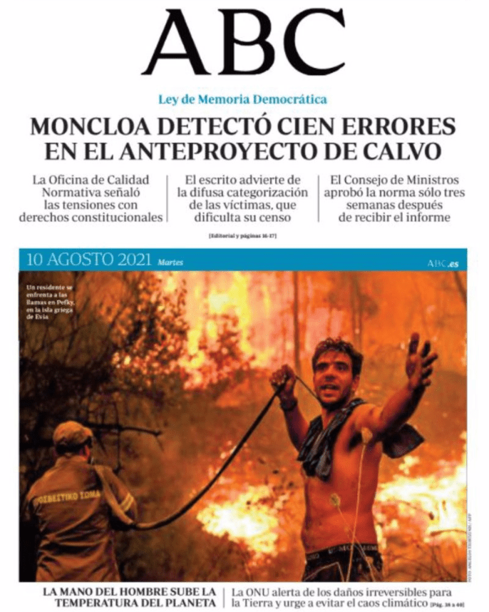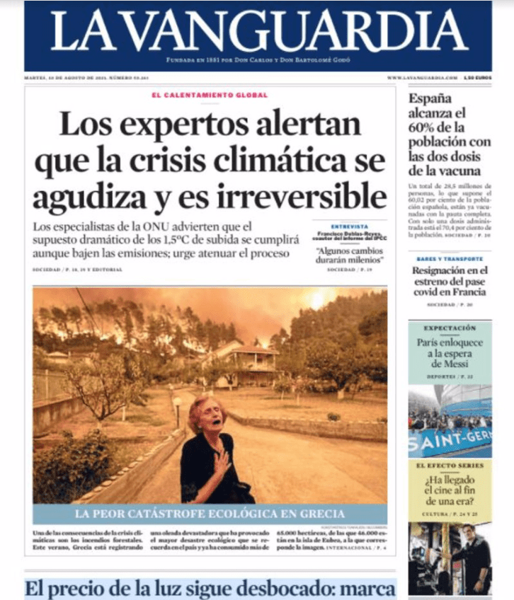 Ahí estaba, este titular en la portada del diario El País «La humanidad a causado ya daños irreversibles al planeta». Sentí un escalofrío en pleno mes de agosto. Avancé con la mirada y fui leyendo uno por uno todos y cada uno de las periódicos del día, y no había ninguno que no mencionase el tema en portada, junto a desoladoras imágenes de los incendios que arrasan medio mundo. De los lugares que puedo mencionar de memoria sin mirar ninguna fuente: Estados Unidos, Rusia, Grecia, Turquía, Italia, Argelia… Ver como se queman muchas zonas del Mediterráneo me preocupa enormemente. Ya no es una tragedia al otro lado del mundo, como la del año pasado en Australia. Aun conservo en mi retina el recuerdo de los canguros y koalas indefensos y desorientados entre llamas, con las que se inundaron las redes sociales y que abrían los telediarios nacionales e internacionales. Ahora lo sufren nuestros vecinos. No me afecta más por la lejanía o cercanía de la tragedia, pero me consta que algunas personas creen que es «una exageración» y que la gente es tremendista, quizá puedan entender la gravedad de la situación si ven que pasa en lugares cercanos.